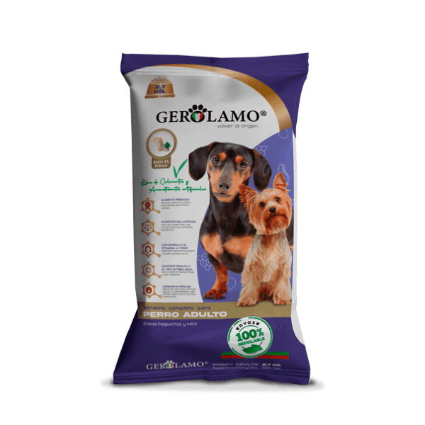 gerolamo Premium Perro Adulto para razas pequeñas satisface los requerimientos nutricionales y paladares más exigentes como es el de las razas pequeñas. Su fórmula balanceada y sus ingredientes de alta calidad permiten el cuidado integral de su salud manteniendo su vitalidad en toda esta etapa. El óptimo tamaño de su croqueta favorece una fácil masticación